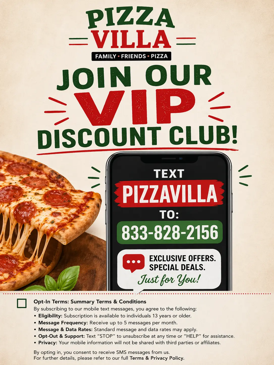 The Villa-Pizza Villa opened its doors in August of 2021. We offer the same great taste and hometown service provided by the original Pizza Villa, owned and operated up until 2020 by John & Charlotte Rooney. We were fortunate to have Mr. Rooney himself teach us all of the history rich recipes served at the original and locally loved establishment.